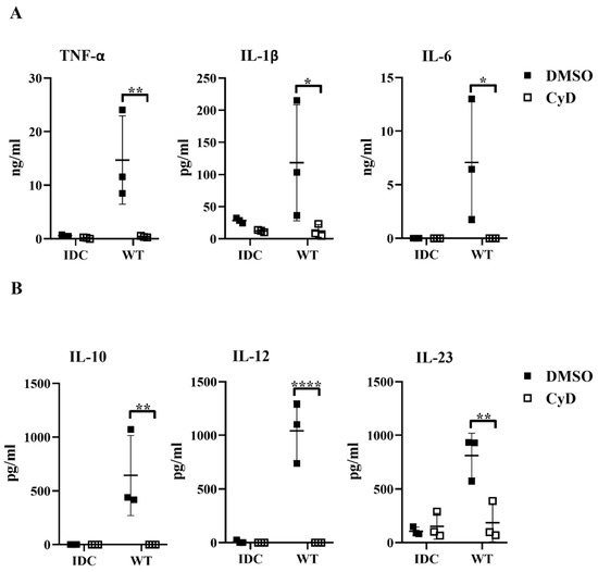 Blocked phagocytosis leads to reduced cytokine secretion by bacteria-exposed moDCs. Five-day moDCs were preincubated with 15 μM CyD or the vehicle control DMSO for 30 min. Then, moDCs were stimulated with WT L. casei at a ratio of 1:4 for 24 h. IDC means cells without bacterial treatment. The concentrations of proinflammatory TNF-α, IL-1β, and IL-6 cytokines (A) and the T-cell-polarizing IL-10, IL-12, and IL-23 (B) were determined from the supernatants of the WT-bacteria-activated moDCs and control IDCs. Figures represent the mean of 3 independent donors ±SD. Each dot represents one donor. The Student’s paired two-tailed t-test was used in the statistical analysis, with significance defined as * p < 0.05, ** p < 0.01, and **** p < 0.0001 between the CyD- and DMSO-treated moDCs.