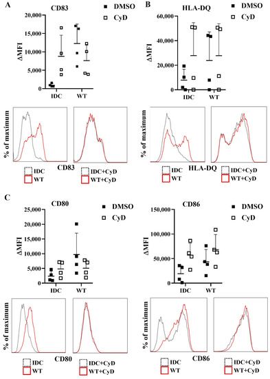 Isolated monocytes were seeded at 1 × 106/mL concentration in serum-free AIM-V medium (Thermo Fisher Scientific, Waltham, MA, USA) supplemented with 100 ng/mL IL-4 (PeproTech EC, London, UK) and 80 ng/mL GM-CSF (Gentaur Molecular Products, Brussels, Belgium), and were differentiated to moDCs for 5 days. On day 2, half of the medium was changed and complemented with 100 ng/mL IL-4 and 80 ng/mL GM-CSF. When indicated, moDCs were preincubated with 15 µM cytochalasin D (CyD, Merck KGaA) dissolved in dimethyl sulfoxide (DMSO, Serva Electrophoresis GMBH, Heidelberg, Germany) for 30 min to inhibit the phagocytosis. DMSO was used as a vehicle control.