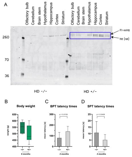 - Manfré, G.; Clemensson, E.K.H.; Kyriakou, E.I.; Clemensson, L.E.; van der Harst, J.E.; Homberg, J.R.; Nguyen, H.P. The BACHD Rat Model of Huntington Disease Shows Specific Deficits in a Test Battery of Motor Function. Front. Behav. Neurosci. 2017, 11, 218. [Google Scholar] [CrossRef] [Green Version]