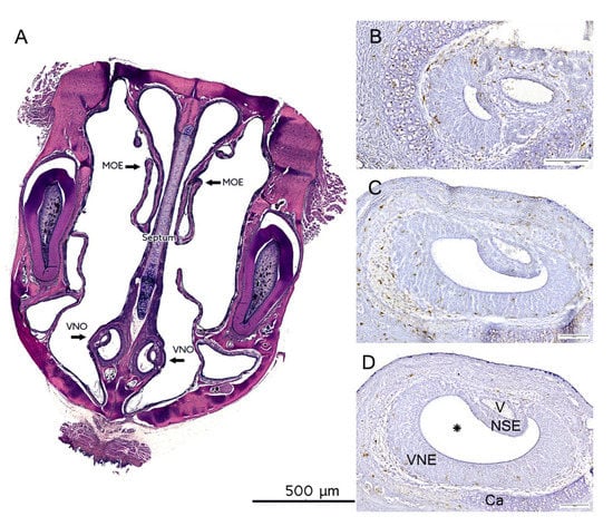 - Weiler, E.; McCulloch, M.A.; Farbman, A.I. Proliferation in the vomeronasal organ of the rat during postnatal development. Eur. J. Neurosci. 1999, 11, 700–711. [Google Scholar] [CrossRef] [PubMed]