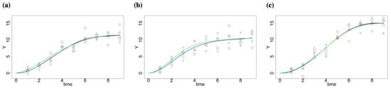 There were factors (or treatments), and each treatment was applied to several independently chosen experimental units (bioreactors). Further, the response (e.g., the rrBChE concentration in the bioreactor) was measured at observation times , say, for (this allows the observation times to be different for different factors). Let us denote the mean response curve (at time ) corresponding to the i-th factor as . We assumed that is a monotonically increasing function of time, over the observation time window .