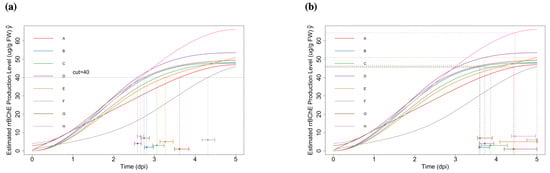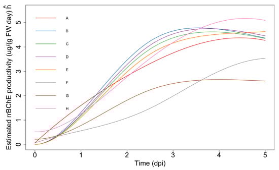 The rrBChE data is available at Dryad []. We have factors labeled A to H and primarily focus on the protein production level (ug rrBChE/g FW rice cells) after sugar induction. We have time points (days post-induction, dpi). Although one potential issue is that we only have one replicate () at each time for each factor, our framework is able to handle this and make appropriate inferences. The observed data and estimations are shown in Figure 3.