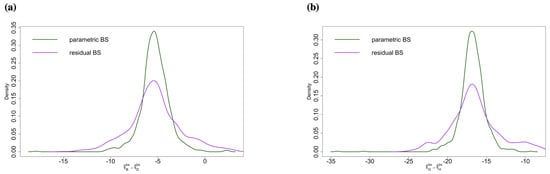 Comparison: empiricalparametric bootstrap sampling distribution and empirical residual bootstrap sampling distribution of (a) , which is significant in the parametric bootstrap case but not in the residual bootstrap case. (b) , which is significant in both cases.