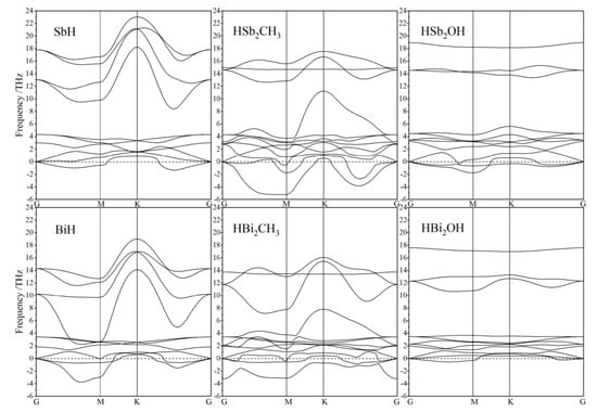 Kinetic stability under atomic oscillations is evaluated with frequency dispersion spectra of phonon modes, as shown in Figure 2. Preliminary phonon calculations by the linear response method [30] indicate that LO–TO frequencies at Brillouin zone center are degenerated for all these Janus and SbH or BiH monolayers, verifying that LO–TO splitting can be neglected. Phonon dispersion spectra of Janus Sb and Bi monolayers represent 12 branches comprised of three acoustic and nine optical branches. Acoustic phonon modes are classified into longitudinal acoustic waves, in-plane and out-of-plane transverse acoustic waves, while optical phonons contain an isolated out-of-plane transverse optical wave and a pair of G-point degenerated longitudinal and in-plane transverse optical waves. Both Janus Sb or Bi monolayers and SbH or BiH monolayers represent partially negative acoustic phonon frequencies in dispersion along G–M while approaching positive values near K point, which is attributed to virtual vibrations of H atoms passivating on Sb or Bi atomic layers. This result suggests that it is preferable to use other elements with a heavier mass and higher bonding strength rather than H atoms to saturate pz orbitals of Sb or Bi monolayers for complete kinetic stability.