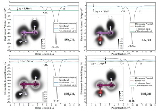 Mulliken population charges on the C and O bonding atoms of −0.5 and −0.7 e (or −0.9 and −1.3 e), respectively, due to their higher electronegativity than that of Sb (or Bi) are in contrast to −0.1 e (or 0.7 e) on hydrogen atoms directly bonding with Sb or Bi atoms, as listed in Table 1, implying substantial charge transfer and electronic cloud shifting out of central layer plane in Janus Sb and Bi monolayers. Accordingly, significant internal electric fields of Janus monolayers are created by the potential differences of ∆ϕ = 5.586, 3.179, 5.262 and 1.734 eV for HSb2CH3, HSb2OH, HBi2CH3 and HBi2OH, as shown in Figure 3. Therefore, it is suggested that inversion symmetry of Sb and Bi monolayers has been broken in these Janus monolayers due to the asymmetric decoration of CH3 or OH. For the Janus monolayers based on a heavy main group element, the electronegativity of center atoms in asymmetrically decorating chemical groups is a judgement giving rise to an intrinsic electric field.