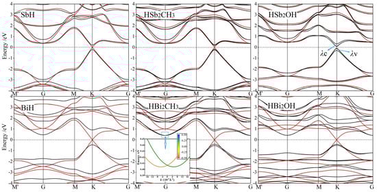 Band structures without SOC (red curves) and with SOC (black curves) of Janus Sb (top panels) and Bi (bottom panels) monolayers, and SbH and BiH monolayers with inversion symmetry are presented for comparison, in which Fermi level is referenced as energy zero (horizontal dash line).