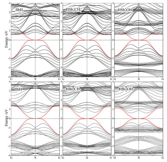 - Gong, Q.; Zhang, G. Spin-orbit coupling electronic structures of organic-group functionalized Sb and Bi topological monolayers. Nanomaterials 2022, 12, 2041. [Google Scholar] [CrossRef]