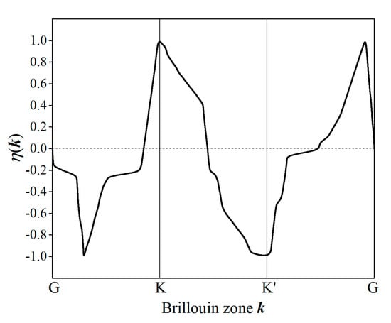 where Pα (α = x, y) denotes momentum matrix element between the lowest conduction band and the highest valence band. Prototypically, the calculated η(k) of HBi2OH monolayer along the high-symmetry path through valley K and K′ points in Brillouin zone is shown in Figure 6, illustrating the contrast of optical selection rule between two valley counterparts. The left-hand and right-hand circular polarized photons are almost purely absorbed at K and K′ valleys, respectively. Therefore, circular polarized photons can distinguish electronic excitation and imbalance electron occupation between the two inversely distributed nonequivalent electronic-valleys in Janus Sb and Bi monolayers without external electric field.