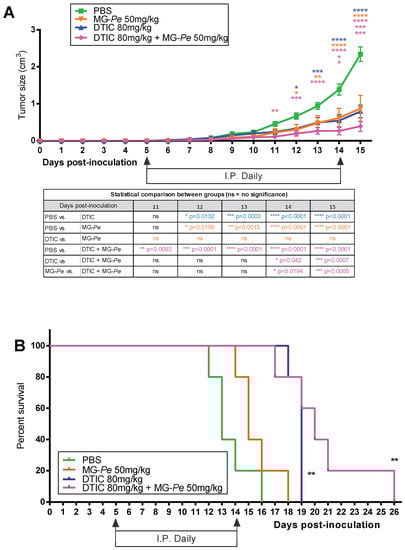 More importantly, the DTIC+MG-Pe combined group showed impaired tumor growth starting at day 11 compared to the control (PBS). Moreover, at the end of the experiment, DTIC+MG-Pe-treated animals developed the smallest tumors (Figure 1A), decreasing 83% compared with PBS and 51% compared with DTIC.