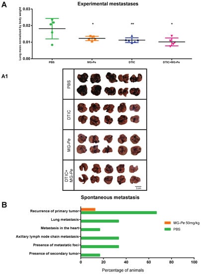 In the experimental lung metastasis model, MG-Pe (alone) and DTIC (alone) reduced metastatic foci in the lung (43% and 46% respectively) when compared to PBS (Figure 2A,A1), showing the antitumoral effect of MG-Pe and corroborating with the data in the subcutaneous tumor growth model (Figure 1A). Additionally, when administered together as MG-Pe + DTIC, it reduced metastatic foci in the lung (53%), showing an adjuvant effect (Figure 2A and lung images in Figure 2A1), corroborating with the data in Figure 1A, which also shows MG-Pe an antitumor action. For the spontaneous metastasis model (Figure 2B), tumors (solid subcutaneous) were allowed to develop; the animals were then treated for ten days (as described in Section 3.3.1). Tumors were then surgically removed, and after one month (without treatment) the metastases were evaluated in both groups (recurrence was analyzed in different organs and tissues). In this qualitative experiment we found that only one treated animal had a recurrence (13%) at the same site as the removed primary tumor, compared to untreated animals that showed multiple metastatic foci at different sites as reported below and visualized in Figure 2B.