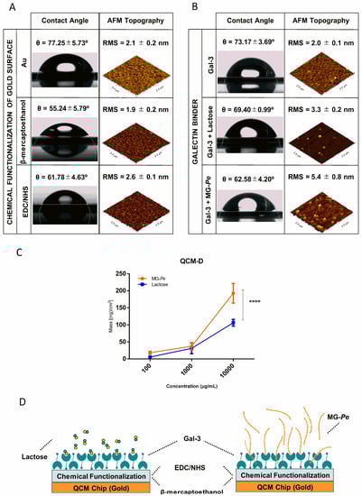 Because of the large size and polydispersity of MG-Pe, several approaches were used to evaluate binding to Gal-3. As seen in Figure 3A,B, we measured the contact angle between water and surface of the gold sensor, under different conditions, to confirm each functionalization step due to surface-free energy modification, from the sensor alone, the chemical modifications with β-mercaptoethanol, EDC/NHS, and Gal-3. The contact angle modification, due to the adsorption binding of MG-Pe and lactose can be observed in the last images. The results shown in Figure 3A indicate the differences between each step, by the contact angle (left column) and also by the roughness (AFM) (right column), showing that each step of the chemical functionalization was confirmed. Moreover, in Figure 3B, the results show a contact angle to the left and the roughness to the right, which indicates that Gal-3 interacts to both lactose and MG-Pe.