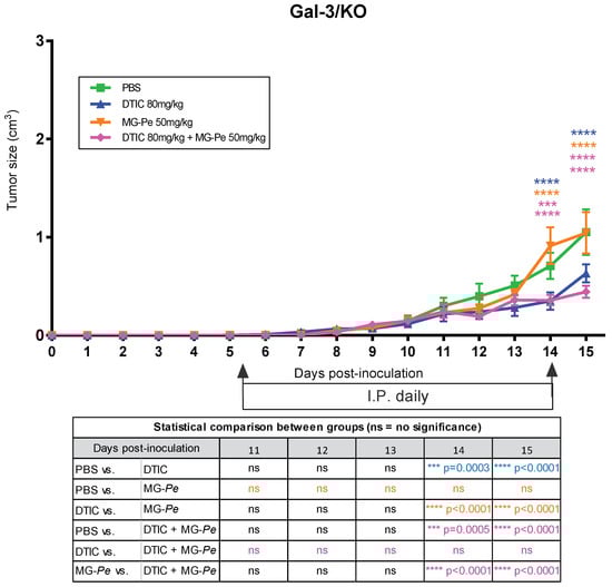 To investigate the influence of Gal-3 on the MG-Pe antitumoral effect, Gal-3 knockout on C57BL/6 mice (Gal-3/KO []) and wild C57BL/6 mice (wild type—WT) were used as a control. Four experimental groups were used: PBS (vehicle); DTIC (80 mg/kg); MG-Pe (50 mg/kg) and the combination of DTIC+MG-Pe (80 + 50 mg/kg).