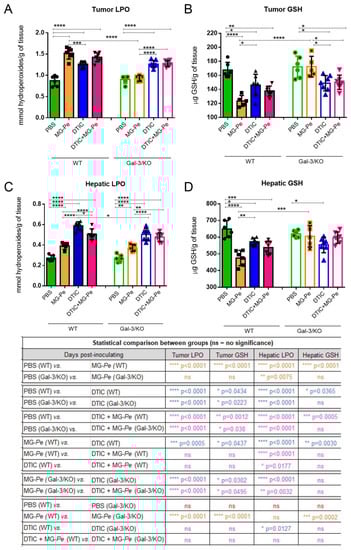In order to evaluate the systemic effects of MG-Pe treatment and the involvement of Gal-3 in these effects, we further evaluated aspects of the hepatic and tumor imbalance of reactive oxygen species in the experimental conditions described. We evaluated the accumulation of oxidized lipids through the measurement of lipid hydroperoxide levels (LPO) and the consumption of reduced glutathione (GSH).