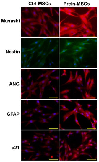 Control (Left panel) and pre-induced MSCs (Right panel) were fixed and stained with specific antibodies, Muisashi, Nestin, ANG, GFAP, and p21, and visualized under fluorescent microscopy (red and green). Blue indicates nucleus. Pre-induced MSCs indicates preinduced-MSCs which are incubated with preinduction media for 24 h.