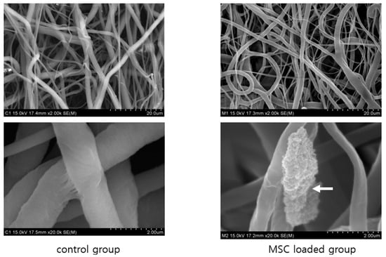 Scanning electron microscopic view of control group and MSC loaded group. Both groups show cellulose/collagen nanofibrous structure (2.0K). The magnified view shows well coated MSCs to the nanofibrous strand (arrow indicates).