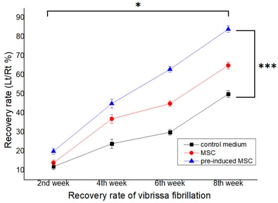 Recovery of vibrissae fibrillation is more pronounced in groups I and II than in the control group. The highest degree of recovery of vibrissae fibrillation is observed in group II (pre-induced MSC). Repeat measure ANOVA, Between time interval; p = 0.0226, Between each group; p = 0.0047. Values of * p < 0.05, *** p < 0.001 were considered statistically significant.