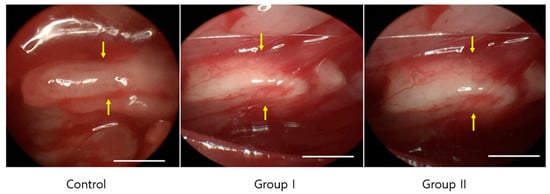 Fifteen adult male Sprague-Dawley rats (6–8 weeks old, weighing 200–250 g; SamtakoBio Korea, Suwon, South Korea) were used in this study. The rats were randomly divided into three treatment groups (n = 10 in each): cellulose/collagen nanofiber (control group), cellulose/collagen nanofiber/MSCs (group I), and cellulose/collagen nanofiber/pre-induced MSCs (group II). Each rat was housed in a separate cage and provided feed and water. They were allowed to adapt to the environment without stress for a week before surgery. This study was approved by the Animal Experimentation Committee (CIACUC2021-S0021).