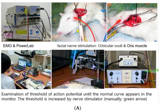 The facial nerves were re-exposed under general anesthesia using isoflurane inhalation at postoperative week 8. After electrical stimulation was applied to the distal part of the nerve conduit using a monopolar tungsten probe, the threshold of action potential was measured as described previously []. In brief, three needle electrodes were inserted percutaneously into the midpoint of the left orbicularis oculi muscle, left orbicularis oris muscle, and superficial muscle layer near the skin (ground needle) to record electrically evoked muscle action potential (MAP) signals. Electrical signals (rectangular current pulse for 0.05 ms) were delivered to the main trunk of the facial nerve using a monopolar stimulating electrode (Xomed-Treace, Jacksonville, FL, USA), which was connected to a pulse generator (A-320D; World Precision Instruments Inc., Sarasota, FL, USA). The distance and direction of the monopolar stimulating probe relative to the facial nerve can be controlled using a micro-manipulator. All MAPs were measured through maximal nerve stimulation. Data were automatically acquired using the lab chart system (PowerLab; AD Instrument, Castle Hill, Australia), which was displayed on a Samsung computer monitor, and then analyzed using the Scope software (AD Instrument). The peak amplitude of the action potential waveform was determined to assess recovery from facial nerve injury.