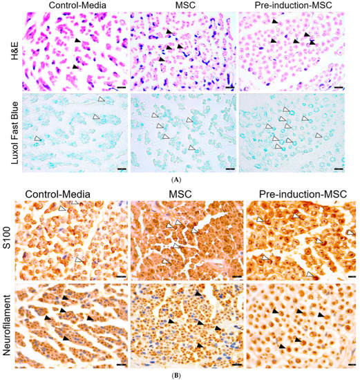 Adult mesenchymal stem cells (MSCs) can be separated from umbilical cord blood, bone marrow, adipose tissue, and the skin []. MSCs can be differentiated into neurons and this property can be utilized as a therapeutic target to promote neuroprotection and neurogenesis. Owing to the absence of precursor cells around damaged areas, regeneration is impossible in these areas. To overcome this limitation, various potent stem cell sources, such as MSCs and neural stem cells, have been used in combination with nerve conduits to treat peripheral nerve defects [,,,]. However, after transplantation of MSCs into the neural damaged area, only a minority of MSCs can be differentiated into neuronal cells in vivo [].