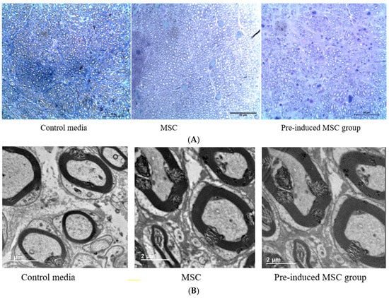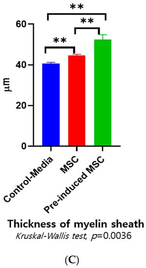 As shown in Figure 8, the axon counts of three groups were similar (n = 255), but gross size of axon is higher in the pre-induced MSC group than other groups. The thickness of myelin sheath is higher in pre-induced MSC group than other groups. The Kruskal-Wallis test showed significant differences between the three groups (** p = 0.0036).