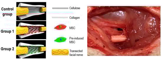 To resolve this problem, chemical compounds or growth factors have been used to induce neural differentiation of MSCs []. However, according to follow-up studies, morphological and molecular transformation of MSCs may occur as a stress response of the cells rather than their actual differentiation into neuronal cells []. During neural differentiation, the endoplasmic reticulum of MSCs is highly susceptible to stress owing to the nature of the differentiation process itself []. If the cell overcomes the stress, it shows further adaptation by performing other functions; otherwise, it dies. []. Recently, MSCs pre-induced via addition of either β-mercaptoethanol or basic fibroblast growth factor to the cell medium were reported to undergo neuronal differentiation [,,,]. Therefore, the present study aims to evaluate the effect of a pre-induced MSC-coated cellulose/collagen nanofibrous nerve conduit for facial nerve regeneration in a rat model, both in vitro and in vivo.