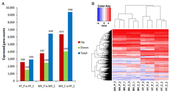 Based on the shoots’ infection results, RNA-Seq analyses were performed on HY and MH at 72 h after inoculation (hai). The samples were made with three biological replicates at each time point. The raw reads varied from 47.13 to 53.84 million. After filtering and trimming, the clean reads varied from 41.93 to 47.80 million. Uniquely mapped reads accounted for 35.15% to 87.93% of the total mapped reads on the Kiwifruit Genome Database (Table 1). According to the total mapped reads, the expression levels of 34,531 genes were calculated using the FPKM method. The number of DEGs between HY and MH was examined at 72 hai with Psa (genes with p < 0.05 found by DESeq were assigned as differentially expressed. Comparing with an HY control, the numbers of up-regulated genes and down-regulated genes in HY_P (HY inoculated at 72 hai) were 2588 and 3787, respectively (Table S1); comparing with an MH control, the numbers of MH _P (MH inoculated at 72 hai) were 1546 and 2499, respectively (Table S2). Overall, the number of DEGs (up- and down-regulated) was significantly higher in HY than in MH (Figure 2A). These results suggest that more DEGs are involved in disease resistance and a large-scale response to pathogen infection in HY.