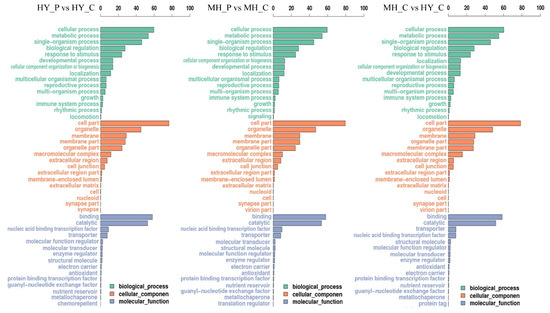 GO analysis was performed to clarify the functions of DEGs in comparisons between the two varieties after Psa infection. GO can be divided into three categories: biological process, cellular component, and molecular function. In the category of biological process, GO, in terms of cellular process, metabolic process, and single-organism process, enriched the most DEGs (Figure 3). In the category of cellular component, the cell part, organelle, and membrane enriched the most DEGs. Binding and catalytic activity acquired the most DEGs in the category of molecular function. Moreover, a large number of DEGs in HY_P compared with HY_C were associated with the significantly enriched in process, as related to the response to organic substance, endogenous stimulus, and hormone. Interestingly, a lot of DEGs in comparison to MH_P and MH_C were significantly enriched in processes such as the single-organism biosynthetic process, carbohydrate metabolic process, cell-wall organization or biogenesis, and polysaccharide-metabolic process, which were involved in cell-wall defense.