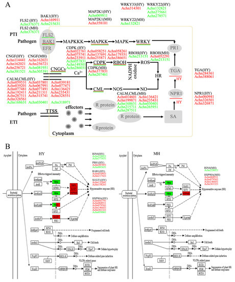 The increase in the cytosolic Ca2+ concentration is also a regulator for production of reactive-oxygen species and localized programmed cell-death/hypersensitive response. The plant cyclic nucleotide gated channel (CNGF) is an important part of plant hypersensitivity. The channels can participate in the regulation of Ca2+ internal flow [30,31]. Six genes encoding the cyclic nucleotide gated channels were assessed in two varieties. Four of six genes were found to respond to Psa in HY and MH, respectively, and three genes were up-regulated in HY (Figure 4A). In particular, Achn162021 and Achn256721 were up-regulated in both varieties after Psa infection. More genes encoding these cyclic nucleotide gated channels were up-regulated in HY after Psa infection. Meanwhile, Ca2+ when combined with a calcium-binding protein (CML) produces NO, which further promotes plant-hypersensitivity responses or autoimmune reactions [32]. We found 23 homologs of CML that were responsive to Psa in HY and MH. Notably, 16 of 19 genes were found to be up-regulated in HY, while 5 of 9 genes were down-regulated in MH. Two genes (Achn136421, Achn235431) were up-regulated higher in HY than in MH, and another two genes (Achn168631, Achn030401) were down-regulated in both varieties. Interestingly, Achn287511 was three-fold up-regulated in HY, while three-fold down-regulated in MH. This showed that more homologs of CML were responsive to Psa in HY than in MH, and the expression of most homologs was increased in HY after Psa infection.