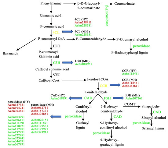 Plant phenols are secondary metabolites, working as signal compounds, pigments, internal physiological regulators, or chemical messengers and functioning in the resistance mechanism of plants against pathogens [37]. Most phenols biogenetically arise from the phenylpropanoid pathway, where some key genes play a key role in phenols production. In our study, a total of 22 DEGs were involved in lignin biosynthesis, including 4-coumarate-CoA ligase (4CL) (two genes), coumaroylquinate (coumaroylshikimate) 3-monooxygenase (C3H) (one gene), cinnamoyl-CoA reductase (CCR) (two genes), ferulate-5-hydroxylase (F5H) (one gene), cinnamyl-alcohol dehydrogenase (CAD) (one gene), and peroxidase (fifteen genes); most of the genes were down-regulated in both varieties after Psa infection (Figure 5). Notably, the expression levels of the 4CL-like gene (Achn258411) and three homologs of peroxidase gene (Achn157331, Achn303851, Achn194241) were significantly up-regulated in HY. Meanwhile, two homologs of the CCR gene (Achn118461, Achn343611) and three peroxidase genes (Achn157331, Achn303851, Achn062751) were also up-regulated in MH. The homolog of the C3H gene (Achn040951) and F5H gene (Achn207361) were just observed and down-regulated in MH in response to Psa infection. Interestingly, the CCR homolog gene (Achn118461) was down-regulated in HY after Psa infection, but up-regulated in MH, which displayed a large difference between HY and MH. In particular, previous studies have reported that glutathione S-transferase (GST) played an important role in flavonoid biosynthesis [38,39]. We found thirteen GST-like genes that were significantly up-regulated in HY, compared to five genes that were up-regulated in MH after Psa infection (Tables S1 and S2).