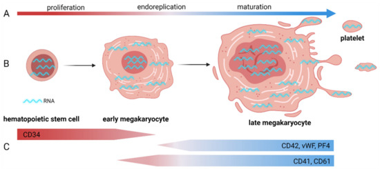 (A) Stages in megakaryopoiesis and thrombopoiesis; (B) RNA metabolism in maturing megakaryocytes and transfer to platelets during thrombopoiesis; (C) different cell markers associated with stages in MK and platelet differentiation (adapted from Davizon-Castillo et al. [5]).