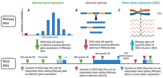 Another challenge is the interpretation and functional validation of RNA-seq results. Most studies focus on the detection of differentially expressed genes and pathways. However, it remains very difficult to understand the biological relevance of these changes. One can focus on a subset of the most significant up- or downregulated genes and validate these changes using qRT-PCR or immunoblot analysis, but this is of course a biased approach. It is also possible to validate a pathway using functional MK or platelet studies that have been designed to study the pathway of interest. The main issue remains that most studies are biased by highly expressed genes, while genes with weak expression but still important functions in MKs and platelets are typically missed. Better analytical approaches and larger datasets are needed. At least some of the challenges of associating IPDs with rare variants, in both coding and non-coding regions of the genome, can be overcome by the integration of multiple layers of information from different assay types. These different assays can be performed simultaneously in single cells by techniques such as G&T-seq [112] (gDNA and transcriptome), 10X Multiome or SHARE-seq [113] (transcriptome and chromatin accessibility) or TEA-seq [114] (transcriptome, chromatin accessibility and cell surface epitope detection). This multiomics approach is increasingly being used in the field of cardiovascular disease [115], although not yet at the single-cell level. By using chromatin accessibility and histone modification data specific for MKs combined with WGS data, the deletion of an important regulatory element near HDAC6/GATA1 was detected as the cause of thrombocytopenia and autism [116]. It was also hypothesized that a combination of platelet RNA-seq and WGS data would be of use to identify which variants in regulatory elements could be causal for an IPD [117]. Combining platelet RNA-seq and WGS data from individuals has led to important new discoveries in the study of platelet disorders [57,63,105,106,107,108], but its application in rare disease bioinformatics, as mentioned above, promises important novel discoveries in rare types of IPDs. Changes in gene expression and aberrant splicing events detected in the platelet transcriptome can be explained by variants in both coding and non-coding parts of the genome (Figure 2A,B). To further causally link aberrant splicing to variants, a deep learning model such as SpliceAI [118] can be used to estimate the probabilities of mutations causing aberrant splicing (Figure 2B). This 32-layer deep neural network estimates the probability of splicing events as a consequence of mutations in both coding and non-coding parts of the genome based on the change in sequence. Finally, the effect of heterozygous variants found in the WGS data could also be assessed by checking for monoallelic expression (Figure 2C). In a study by Murdock et al. [119], 115 undiagnosed patients with suspected Mendelian conditions underwent sequencing by RNA-seq and WES or WGS using whole blood and skin fibroblasts. The transcriptome-directed approach resulted in an additional diagnostic rate of 12% across the entire cohort directly due to the addition of RNA-seq data, solving 17% of cases that could not be diagnosed using only WES/WGS. This highlights the possible utility of combining these two datasets in the study of IPDs. However, platelet transcriptome data have not yet been generated in a diagnostic setting for IPDs.
