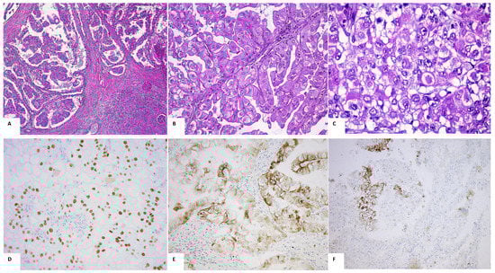 Morphological and immunohistochemical features of TFE3-tRCC. Captions: (A–C): Morphology and features. (A/B) Papillary architecture; C: eosinophilic cells with prominent nucleoli (HES staining, magnification (A) ×50, (B) ×200, (C) ×200); (D–F): immunohistochemical features. (D): TFE3 positivity of the majority of nuclei; (E): p504 cytoplasmic positivity for some cells; (F): CAIX positivity in hypoxic territory (TFE3/p504/CAIX IHC, respectively, magnification ×200); tRCC: translocation renal cell carcinoma; HES: hematoxylin–eosin–safran.