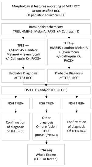 Break-apart TFE3 or TFEB fluorescence in situ hybridization (FISH) performed on formalin-fixed and paraffin-embedded (FFPE) tissue sections is the most widespread method used and has long been considered the gold standard. This technique allows confirmation of the TFE3 or TFEB rearrangement without providing information on the fusion partner. Typical break-apart signals of TFE3 gene translocation consist of split red and green signals, the normal result being a merged hybridization signal, as for TFEB. FISH assays may show equivocal or false-negative results due to intrachromosomal inversions involving TFE3, resulting in a subtly spaced fluorescence signal that is less obvious to visualize than a translocation. This difficulty has been demonstrated for rearrangements involving NONO, GRIPAP1, RBMX and RBM10, consisting of the pericentric or paracentric inversion of chromosome X, respectively, for which there is close proximity of the genes involved in the rearrangement [27,28]. In the case of a strong suspicion of tRCC with negative FISH, specific targeted RT-PCR or RNA sequencing (RNA-seq), or whole exome sequencing is recommended.