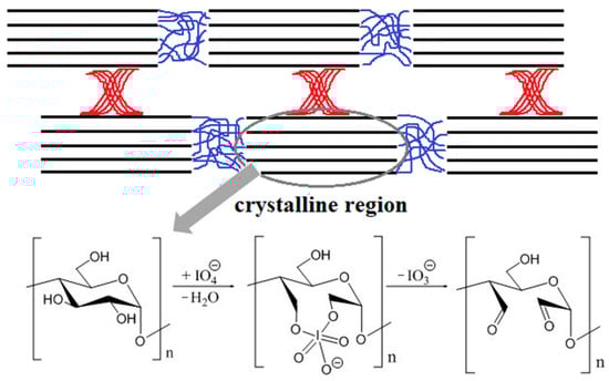 Nowadays, numerous studies are focused on the topic of modification of nanocrystalline polysaccharides. The periodate oxidation process is one of the methods of modification of nanocrystalline polysaccharides. In this process, the bond between C2 and C3 in the glycosidic ring is cleaved, and then two aldehyde groups are introduced to these carbon atoms []. This simple one-pot method requires only sodium periodate and water as the oxidant and solvent, respectively (Figure 1). The aldehyde groups introduced into the polysaccharide structure can serve as cross-linking agents for biopolymers. The dialdehyde polysaccharides based on pectin [], chitosan [], xylan [], alginate [], starch [], hyaluronic acid [], pullulan [], galactomannan [], cellulose [], carboxymethyl cellulose [], and xanthan gum [] are used for cross-linking of polymers containing amino groups.