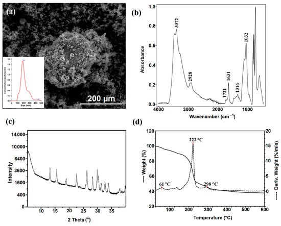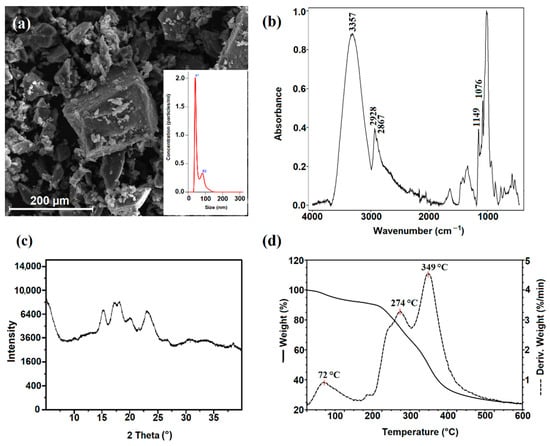 (a) SEM image, with inset showing the size distributions and particle concentrations of starch nanocrystals; (b) ATR-FTIR spectra; (c) X-ray diffraction (XRD) patterns; and (d) TGA-DTG curves of starch nanocrystals.