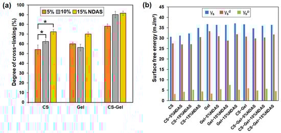 (a) Degree of cross-linking of chitosan (CS), gelatin (Gel), and chitosan–gelatin (CS-Gel, 1:1) cross-linked by 5%, 10%, and 15% cross-linker; statistical significance is indicated with asterisks: * p < 0.05. (b) The surface free energy (γs) and its polar (γsp), and dispersive (γsd) components for biofilms based on chitosan (CS), gelatin (Gel), and chitosan–gelatin (CS-Gel) cross-linked with 5%, 10%, and 15% NDASs.
