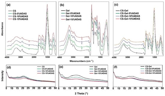 The crystalline structure of CS, Gel, and the CS-Gel films cross-linked by NDASs was characterized by XRD patterns and is shown in Figure 5d–f. The X-ray diffractograms of CS show crystalline diffraction peaks at 2θ = 10.5°, 15.1°, and 20.9°. According to the literature [], these crystalline peaks of pure CS can be ascribed to the reflection planes of (020), (110), and (200). All the chitosan films cross-linked with NDASs showed diffraction peaks at 2θ = 20.9°, while the intensity of this peak decreased with the increase in the cross-linker amount. The peaks at 2θ = 10.5° and 15.1° for CS-15%NDAS disappeared. For gelatin, the signal located at about 2θ = 8.6° corresponds to the inter-helix distance of the triple helix of gelatin, and a broad diffraction peak in the 2θ range of 15.0–25.0 is typical of the amorphous fraction of gelatin []. The obtained pattern is consistent with the literature data []. For the gelatin samples, an increase in the amount of cross-linking agents caused a decrease in the intensity of signals. However, the chitosan/gelatin mixture did not show any crystalline peaks, indicating the amorphous structures of chitosan and gelatin. This result also exhibited that the chitosan and gelatin were mixed well, forming the composite []. The intensity of the diffraction patterns for CS-Gel cross-linked by NDASs decreases with an increasing amount of cross-linking agent. The same effect was observed for cross-linked gelatin and chitosan films.