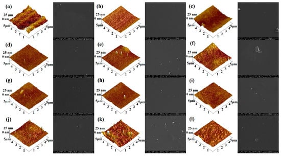 AFM and SEM (1000×) images of (a) chitosan films cross-linked by (d) 5% NDASs, (g) 10% NDASs, and (j) 15% NDASs; (b) gelatin film cross-linked by (e) 5% NDASs, (h) 10% NDASs, and (k) 15% NDASs; and (c) chitosan–gelatin films cross-linked by (f) 5% NDASs, (i) 10% NDASs, and (l) 15% NDASs.