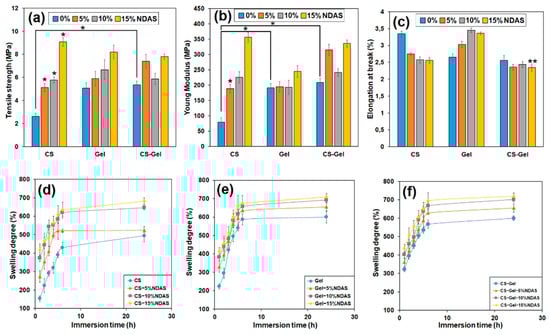 The value of (a) tensile strength, (b) Young’s modulus, and (c) elongation at break of chitosan (CS), gelatin (Gel), and chitosan–gelatin (CS-Gel) cross-linked by 5%, 10%, and 15% cross-linking agent; statistical significance is indicated with asterisks: * p < 0.05, ** p < 0.01. The swelling degree of (d) chitosan, (e) gelatin, and (f) chitosan–gelatin cross-linked by 5%, 10%, and 15% cross-linker (NDASs).