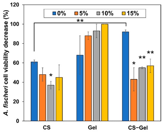 The decrease in A. fischeri cell viability upon 5-minute exposure to chitosan (CS), gelatin (Gel), and chitosan–gelatin (CS-Gel) films prepared by cross-linking with 0%, 5%, 10%, or 15% addition of dialdehyde starch nanocrystals (NDASs). Statistical significance is indicated with asterisks: * p < 0.05, ** p < 0.01.