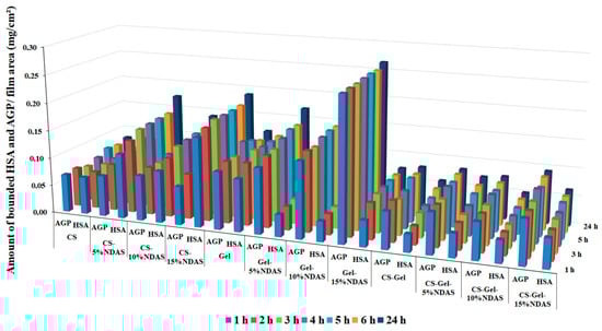 In the case of the non-cross-linked chitosan film, the preference for binding one of the proteins is no longer apparent. Both HSA and AGP proteins are bound in similar amounts, and the addition of NDASs as a cross-linking agent increases the amount of adsorbed HSA.