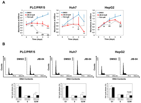 Because our previous report showed the effect of JIB-04 on the viability and cell cycle of human colorectal cancer cells [19], we attempted to determine if JIB-04 could influence those of human HCC cells. When three different human HCC lines, namely PLC/PRF/5, Huh7, and HepG2, were treated with 6 μM JIB-04 for 4 days, the viability of all three cell lines was significantly decreased in a time-dependent manner compared with DMSO-treated controls (Figure 1A). The effect of JIB-04 on cell viability was comparable to that of trichostatin A (TSA), which was used as a control drug because of its known ability to target liver CSCs [29,30]. In addition, we investigated the effect of JIB-04 on the cell cycle progression in HCC cells using a FACS analysis to assess whether the reduced cell viability (Figure 1A) was related to any defects in the cell cycle. Compared with DMSO-treated controls, all the JIB-04-treated HCC cells showed increased G1-phase subpopulations and decreased G2/M-phase subpopulations (Figure 1B), suggesting the occurrence of G1/S arrest in JIB-04-treated HCC cells. Thus, these data suggested that the reduced cell viability in JIB-04-treated HCC cells might be partly caused by JIB-04-induced cell cycle defects.