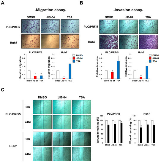 JIB-04 reduces the capacity of cell migration and invasion in HCC cells. (A) Cell migration was investigated with transwell assays after treatment with DMSO, 6 µM JIB-04, or 4 µM TSA for 24 h (n = 3). (B) Invasive ability was examined in transwells coated with Matrigel after treatment with DMSO, 6 µM JIB-04, or 4 µM TSA for 24 h (PLC/PRF/5 (n = 4); Huh7 (n = 3)). (C) Cell migration was assessed with a wound-healing assay. Cells were scraped with a yellow pipette tip and treated with DMSO, 6 µM JIB-04, or 4 µM TSA for 24 h. Cells were imaged under a light microscope after injury. Cell migration was quantified by measuring remaining wound areas before and after treatment with DMSO, 6 µM JIB-04, or 4 µM TSA. Data are represented as mean ± SEM of triplicate measurements. * p < 0.05, ** p <0.01 compared with DMSO-treated controls.