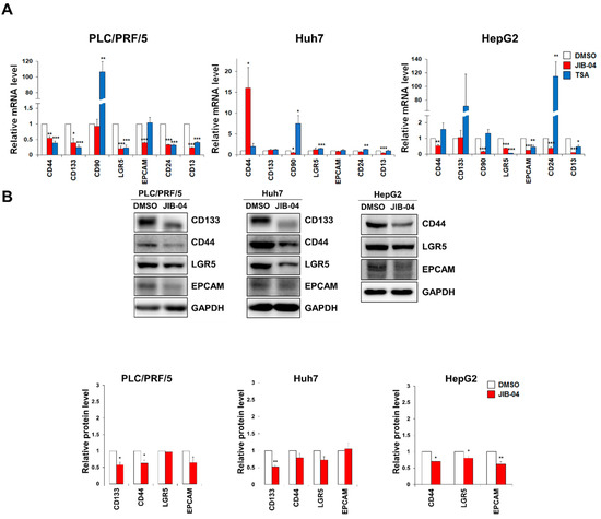 To assess the effect of JIB-04 on the stemness of liver CSCs, we investigated the mRNA expression levels of liver CSC marker genes, including CD44, CD133, CD90, LGR5, EpCAM, CD24, and CD13, in three HCC cell lines, namely PLC/PRF/5, Huh7, and HepG2, after JIB-04 treatment. Our qRT-PCR data showed that the mRNA expression levels of CSC marker genes were generally reduced in all three JIB-04-treated cell lines compared to DMSO-treated control cells, implying a significant reduction in the liver CSC population following JIB-04 treatment (Figure 3A). Next, we analyzed the protein levels of CSC markers in JIB-04-treated HCC cells. A Western blot analysis demonstrated that the protein levels of CD44, LGR5, and EpCAM were decreased in all three HCC cell lines.