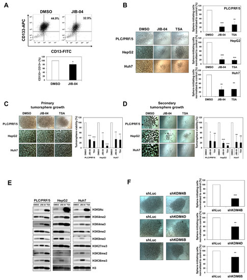 Many lines of evidence support that CSCs enable themselves to initiate and drive tumorigenesis, which may contribute to the chance of relapse. First, we focused on the CD133+/CD13+ population in HCC cells, as CD133+/CD13+ hepatocytes are known to possess CSC characteristics [29]. We investigated the effect of JIB-04 treatment on CD133+/CD13+ cells using a FACS analysis. Our FACS data showed that the CD133+/CD13+ population was lower in JIB-04-treated cells than that in DMSO-treated control cells (Figure 4A), suggesting the potency of JIB-04 as a selective drug for targeting liver CSCs. Furthermore, we performed tumorsphere formation assays to investigate the effect of JIB-04 on tumor initiation, growth, and relapse. Since CSCs can form tumorspheres in serum-free culture medium on non-adherent culture dishes, tumorsphere formation assays are very useful for studying the stem-cell-like properties of CSCs. To confirm whether JIB-04 affected stem-cell-like properties such as tumor initiation, growth, and relapse abilities, we established an LCSC sphere-forming culture system under three-dimensional culture conditions, as previously described [19]. To begin, the effect of JIB-04 on the tumor initiation ability of CSCs was evaluated using three different HCC cell lines. We cultured PLC/PRF/5, Huh7, and HepG2 tumorspheres on non-adherent culture dishes after treatment with DMSO, 6 μM JIB-04, or 4 μM TSA for 24 h. After 7 days, the DMSO-treated control cells developed dense and round-shaped tumorspheres; however, the JIB-04-treated cells failed to form tumorspheres, remaining almost as tiny spheres (Figure 4B, left panel). Quantitative analysis with a cell-counting kit (CCK) assay demonstrated that JIB-04 treatment resulted in a decrease in the percentage of sphere-initiating cells to about 20% of that of control cells and was comparable to the TSA treatment in inhibiting the initiation of tumorspheres (Figure 4B, right panel). Furthermore, to evaluate the ability of JIB-04 to diminish tumorsphere growth, we induced tumorsphere formation for 5 days and subsequently treated the spheres with DMSO (mock control), 6 μM JIB-04, or 4 μM TSA for 2 days. The size of JIB-04-treated tumorspheres was found to have reduced (Figure 4C, left panel). Consistent with these morphological changes, CCK assays further supported that JIB-04 treatment reduced the viability of tumorsphere cells, suggesting that JIB-04 inhibited the growth of the tumorspheres by targeting CSCs (Figure 4C, right panel). To assess the effect of JIB-04 on relapse, we developed secondary tumorspheres by culturing the surviving cells shown in Figure 4C (left panel) in a standard stem cell medium without additional drug treatment for 12 days. The control cells derived from mock-treated primary tumorspheres were able to form secondary tumorspheres comparable to the primary tumorspheres. In contrast, the surviving cells derived from JIB-04-treated primary tumorspheres mostly failed to develop secondary tumorspheres (Figure 4D, left panel). As evident from the CCK assays, the number of viable cells in the secondary tumorspheres derived from JIB-04-treated primary tumorspheres was also reduced compared with that observed for DMSO-treated controls, implying that the regrowth of tumorspheres was efficiently suppressed by pretreatment with JIB-04 (Figure 4D, right panel).