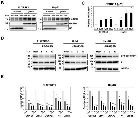 Based on our findings, we next questioned whether the PI3K-Akt signaling pathway was responsible for JIB-04-induced G1/S cell cycle arrest in HCC cell lines, as shown in Figure 1B. To achieve this, AKT protein levels in HCC cell lines after treatment with DMSO or JIB-04 were first analyzed with a Western blotting analysis using a pan-total AKT antibody. As shown in Figure 5A, JIB-04 treatment reduced AKT protein levels in a dose-dependent manner. We then investigated the nuclear translocation of FOXO proteins in JIB-04-treated HCC cells because the AKT-dependent phosphorylation of FOXO factors results in their cytoplasmic accumulation and subsequent degradation, thereby eliminating their transactivation capacity [32,33]. To determine whether JIB-04 caused the nuclear translocation of FOXO3a, we performed a cell fractionation analysis in PLC/PRF/5 and HepG2 cell lines after treatment with DMSO or JIB-04. In JIB-04-treated PLC/PRF/5 and HepG2 cells, the treatment induced the accumulation of FOXO3a in the nucleus in a dose-dependent manner (Figure 5B). Since FOXOs control cell cycle progression through the transcriptional regulation of cyclin-dependent kinase (CDK) inhibitors such as p21, p27, and p15 [34,35,36,37], we assumed the increased expression in CDK inhibitors by the JIB-04-induced nuclear enrichment of FOXOs. Our qRT-PCR analysis revealed that the mRNA expression of the p21(CDKN1A) gene was induced by JIB-04 treatment, but the expressions of p15 and p27 did not increase (Figure 5C, Supplementary Figure S4). Finally, we investigated RB activation and the expression of E2F target genes because p21 can lead to the activation of RB and subsequently cause the suppression of E2F-mediated transcription in the nucleus [38,39]. A Western blot analysis revealed that JIB-04 treatment reduced the phosphorylation levels of RB protein, indicating RB activation (Figure 5D). In addition, the qRT-PCR assay showed that the mRNA expressions of E2F target genes in JIB-04-treated PLC/PRF/5 and HepG2 cell lines were significantly decreased in a dose-dependent manner, suggesting RB-mediated inactivation of the E2F transcription factor (Figure 5E). Thus, these results suggested that the AKT-FOXO3a-p21-RB-E2F axis is involved in JIB-04-mediated anti-cancer effects.