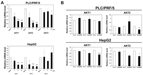 Since JIB-04 treatment reduced the expression of AKT protein (Figure 5A), we hypothesized that the JIB-04-induced inhibition of certain histone demethylases may cause the downregulation of the AKT gene. Therefore, we investigated the expressions of AKT family genes (AKT1, AKT2, and AKT3) in JIB-04-treated PLC/PRF/5 and HepG2 cells. The qRT-PCR analysis revealed that the mRNA expressions of AKT1 and AKT2 were decreased upon JIB-04 treatment, but it was not altered for the AKT3 gene (Figure 6A). To determine which histone demethylase was related to this AKT transcriptional regulation, we investigated the mRNA expression levels of AKT1 and AKT2 in KDM4B-, KDM4D-, and KDM6B-knockdown cells. Our data showed that only KDM6B depletion significantly decreased the AKT2 mRNA expression in both the PLC/PRF/5 and HepG2 cell lines (Figure 6B). Moreover, correlation analysis indicated that the expressions of AKT2 and KDM6B were positively correlated (Figure 6C). In addition, decreased AKT2 mRNA levels were observed in two different KDM6B-depleted cell lines (Figure 6D). These results suggested that KDM6B is responsible for AKT2 gene regulation.