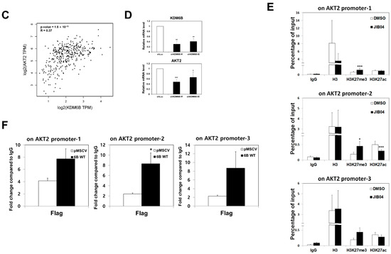 Since KDM6B is known to be responsible for erasing the tri-methylation of lysine-27 on histone H3 (H3K27me3) [40], we investigated whether JIB-04 treatment influenced the H3K27me3 modification level at the AKT2 gene promoter in PLC/PRF/5 cells. Our ChIP assay revealed that the H3K27me3 levels at the AKT2 gene promoter were increased by JIB-04 treatment, whereas the H3K27ac levels were reduced (Figure 6E). These data suggested that the increased levels of H3K27me3 by JIB-04 treatment may contribute to the downregulation of AKT2 expression. To determine whether KDM6B could associate directly with the AKT gene promoter, we performed a ChIP assay using PLC/PRF/5 cells stably expressing an empty vector or FLAG-tagged KDM6B. The ChIP assay confirmed that KDM6B protein was significantly enriched in the promoter region of AKT2 (Figure 6F). Collectively, these results suggested that KDM6B is involved in the transcriptional activation of AKT2 via the downregulation of H3K27me3 at the AKT2 gene promoter.