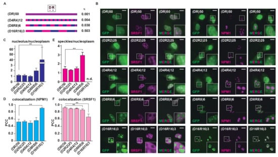 The colocalization analysis of GFP-(DR)50 variants with NPM1 or SRSF1 was performed with Fiji ImageJ software using the EzColocalization plugin [], and the PCC for each combination was calculated.