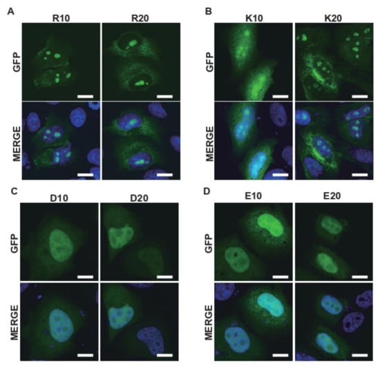To investigate how the position of oppositely charged residues in the R-MCDs affects their subcellular localization, we synthesized (DR)50 variants with different charge distributions as models for R-MCD (Figure 1A). All (DR)50 variants carried the same number of R (n = 50) and D (n = 50) residues, and the charge patterning was the only difference, as indicated by the charge patterning parameter κ (Figure 1A and Figure S1) []. As previously reported, when overexpressed in HeLa cells, green fluorescent protein (GFP)-(DR)50 colocalized with serine/arginine-rich splicing factor 1 (SRSF1), a nuclear speckle marker (Figure 1B) []. When we changed the charge patterning without changing the net charge, (D8R8)6 tended to accumulate in the nucleolus, and (D16R16)3 localized almost exclusively to the nucleolus, as shown by a good Pearson correlation coefficient (PCC) with a nucleolar marker, NPM1-DsRed [] (Figure 1B–F). Reportedly, the localization of proteins to the nucleolus requires the presence of basic amino acids such as R and K at high levels [,,]. However, in the case of (DR)50 variants, even though both (DR)50 and (D16R16)3 had the same number of D and R residues and equal net charges, (D16R16)3 migrated to the nucleolus, whereas (DR)50 accumulated in nuclear speckles. This suggests that uneven intramolecular charge distribution may be a key determinant of protein localization to MLOs. To elucidate the roles of the acidic and basic blocks of (D16R16)3 in the nucleolar localization, we tested the localization of contiguous acidic and basic amino acids. When we overexpressed R10, R20, K10, or K20, contiguous basic amino acid chains of different lengths showed nucleolar localization (Figure 2A,B). However, D10, D20, E10, or E20 expressed in HeLa cells showed no specific localization to MLOs (Figure 2C,D), suggesting that the localization of (D16R16)3 to the nucleolus is owing to the presence of contiguous basic amino acids. These results indicate that the primary sequence of oppositely charged residues determines the MLO protein targets.